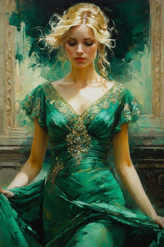 Платье благородно‑малахитового оттенка мягкими волнами касалось пола; невесомое кружево в тон прикрывало крыльями тонкие плечи. Золотистые локоны с лица убраны назад, в затейливый узел; основной каскад завитками спадал до самой талии. Подвеска на шее и капли серёг в ушах дополняли друг друга переливами изумрудов.