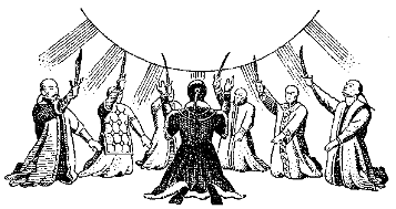 Монах подступил вплотную к воинам–монголам и протянул им высокий желтый колпак.