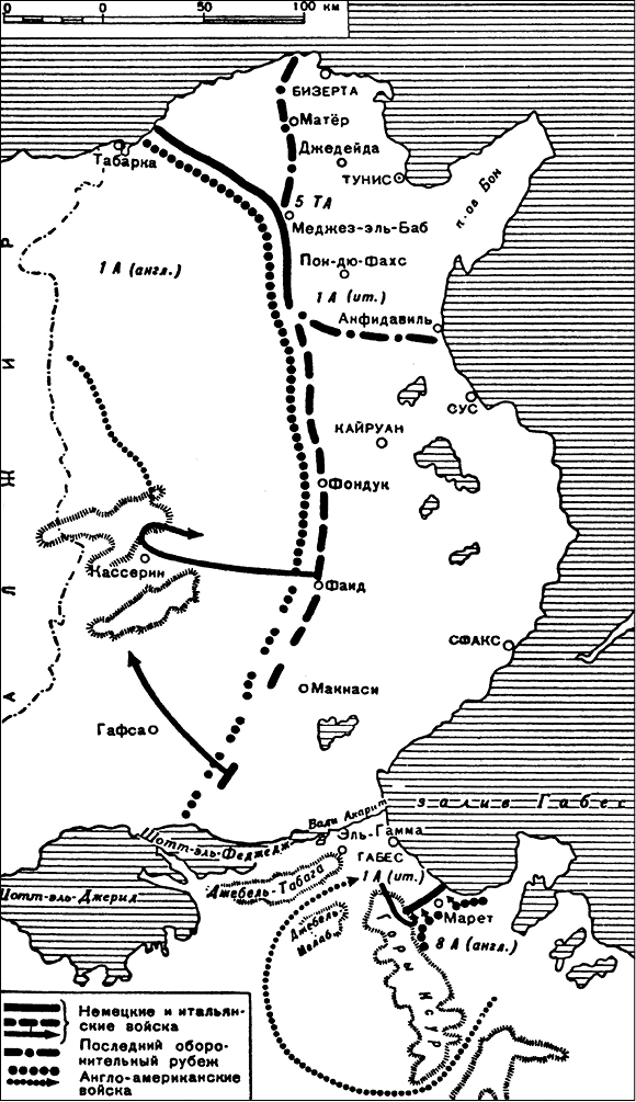 Последние бои в ТунисеКогда наступил конец января и 8-я английская армия захватила Триполи, операции армий Монтгомери и Эйзенхауэра стали проводиться в тесном взаимодействии. Генерал Александер, бывший до сих пор главнокомандующим английскими вооруженными силами на Ближнем Востоке, принял командование всеми сухопутными соединениями союзников, находившимися в Северной Африке. Ему подчинялась теперь 8-я английская армия, которая уже собиралась перейти ливийско-тунисскую границу, и 1-я английская армия в Тунисе.