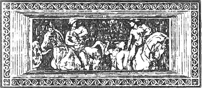 Впереди шла, по три в ряд, толпа празднично разодетых, молодых девушек, державших в руках огромные блюда овощей и плодов, первенцев жатвы, приносимой в жертву богине Деметре. За ними несколько маленьких мальчиков несли на тарелках горы так называемых амфифонтов, пирожков Артемиды. Далее следовала толпа низших служителей храмов. У многих из них были в руках жертвенные чаши, кривые ножи, священные сосуды и небольшие связки дров для сожжения на алтарях. Вот появились и жертвенные животные: среди целого стада быков и белых овец с вызолоченными рогами и гирляндами зелени на шеях резко выделялась стройная, трепетная лань, которую вёл на ремне молодой жрец. Тут же находилось и несколько совершенно чёрных овец, предназначавшихся в жертву грозным евменидам и богам преисподней.