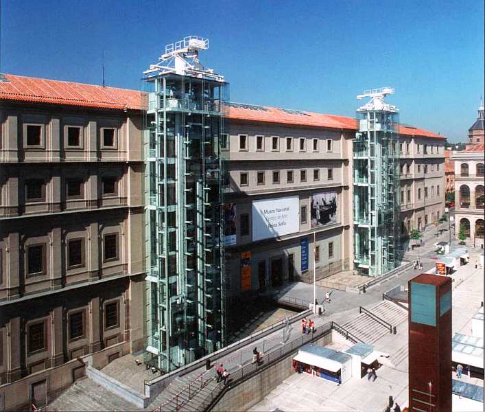Только коллекции Прадо располагаются в изначально предназначенной для них постройке. Центру искусств или Музею королевы Софии, который в просторечии получил наименование «Софиду» по аналогии с парижским Центром современного искусства Жоржа Помпиду, был отдан комплекс зданий старинного Главного госпиталя. Фактически строение спас от сноса указ в 1977, присвоивший ему статус памятника национально-художественного значения. В 1980 под руководством Антонио Фернандеса Альбы началась его реставрация, к которой позже подключились Хосе Иньегес де Озоньо и Антонио Васкес де Кастро. Во время реконструкции внутренних помещений были сохранены детали прежнего интерьера. Решительную экспансию современности в традиционные формы на главном фасаде бывшего госпиталя демонстрируют связывающие этажи прозрачные лифтовые башни, спроектированные британским архитектором Иэном Ричи, которые были возведены в 1992. А уже в 2002–2005 французский зодчий Жан Нувель пристроил новые помещения, расширив площадь музея и придав ему отчетливый модернистский облик.