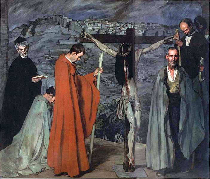 Словно забыв о Карлосе Хасе, Сулоагу называют родоначальником национального пейзажа. В данном полотне его пейзаж, как, впрочем, и в предыдущей картине, выразительно эмоционален. Но если в «Человеке из Сеговии» он воспринимается в реалистическом ключе, то здесь природа мистическая. Характерные лица, застывшие перед свершившимся распятием, существуют в ненастной современности, будто несущей отзвук грозы над Толедо из мира Эль Греко. Линии раскинутых рук Иисуса будто продолжаются в пространстве, вместе с перекладиной креста создавая крепостную стену города, который хорошо виден в далекой перспективе. Это не Иерусалим (хотя оливковые посадки – как воспоминания о «молении о чаше» в Гефсиманском саду), а современный испанский городок, охраняемый жертвой Богочеловека. Особенностью художественного дара Сулоаги является умение находить декоративную составляющую в видимом пространстве. Даже в мрачной мистерии багряным плащом персонажа на первом плане не только исполнена символическая функция, напоминающая о пролитой крови, но и произведен удивительно тактичный декоративный эффект.