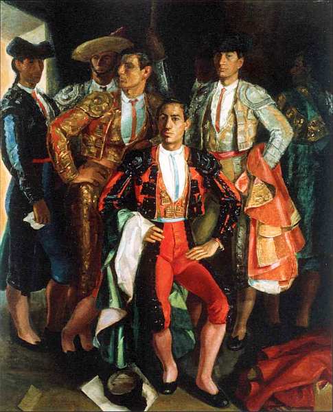 Национальное зрелище Испании, ее «марка», коррида, «бой быков» – символ жизни и смерти, победы и поражения, мужества и отваги. Она предстает перед каждым зрителем, будь это в деревне или на столичной арене, парадной стороной, а ее участники – рыцарями без страха и упрека. Именно таковой и изобразил здесь квадрилью художник. На холсте – доблестные помощники матадора (или новильеро), постоянно действующие рядом с ним на арене, – два пикадора, три бандерильеро, оруженосец и сам знаменитый боец из Аликанте Хуан Ортис Сентено в красно-черном костюме, готовый к выходу на публику.