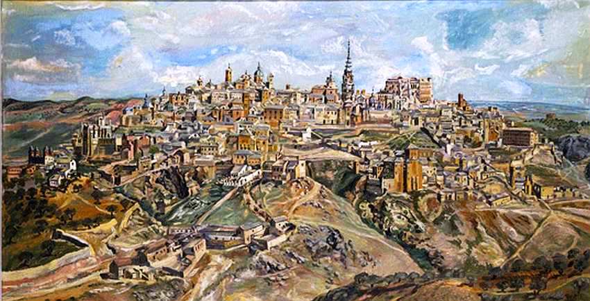Однако представленный пейзаж – не ночной и не грозовой. Скорее, живописец опирался на композицию великого Эль Греко «Вид и план Толедо». На данном холсте над городом только собираются стремительные облака. Панорама небольшого по масштабу Толедо поистине величественна. Художнику удалось передать иллюзию, будто постройки не «сходят» вниз по отлогим холмам, а именно взбираются ввысь, словно устремленные в небеса. Это подчеркнуто готической колокольней самого большого в Испании кафедрального собора. Она, как и в реальности (90 м!), доминирует над пейзажем. Паленсиа очень точен в красках – глинистая и песчаная почва, сероватая зелень, погашенное серебро листвы оливковых деревьев. Сложность рельефа, усугубленная геометрией дорожек и тропинок (в Толедо они пролагаются по стокам дождевых вод), крепостных стен и построек почти делает панораму результатом умышленности авангардистского толка.