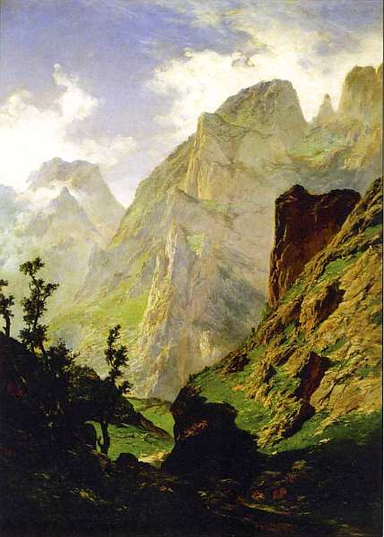 В этом виде горных вершин зрителю дано «примерить» на себя роль путешественника. Художник умело и уверенно руководит его взглядом, обращенным из тенистого ущельица (тоже на высоком отроге) в глубину и высь пространства, от которых может захватить дух. «Спасительной соломинкой» в этой композиционной аранжировке оказываются силуэты деревьев на первом плане, за которые можно «зацепиться» и «закрепиться». Словно ворсистая драгоценная ткань, изумрудный мох и трава лишь подчеркивают твердость острых скальных масс. Кисть живописца ювелирно точна в изображении подробностей жизни молодых гор и свободна и широка в передаче бега облаков.