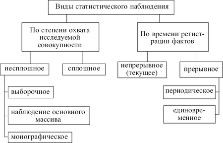По времени регистрации фактов наблюдение может быть непрерывным и прерывным. Прерыывное в свою очередь включает периодическое и единовременное. Непре-рыгвное (текущее) наблюдение осуществляется путем непрерывной регистрации фактов по мере их возникновения. При таком наблюдении прослеживаются все изменения изучаемого процесса или явления, что позволяет следить за его динамикой. Непрерывно ведется, например, регистрация органами записи актов гражданского состояния (ЗАГСа) смертей, рождений, браков. На предприятиях ведется текущий учет производства продукции, отпуска материалов со склада и т. д.