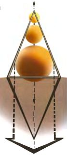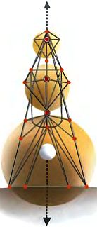 Внутри конструкции основной пирамиды ваше тело принимает форму трех меньших по размеру пирамид, стоящих одна над другой. Чем ниже они расположены, тем они тяжелее. Механические элементы шеи и талии ясно видны на изображении этой структурной модели: сферический шарнир, как подшипник, удерживает вес более крупных сфер и точку схождения пирамид. Чжан чжуан учит вас правильному совмещению этих конструкций.