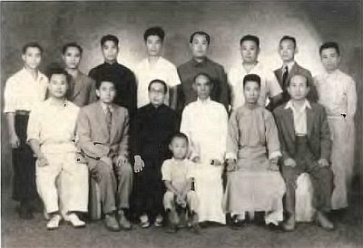 Великий Мастер Ван Сянчжай (в классическом китайском наряде) сидит вместе со своими учениками