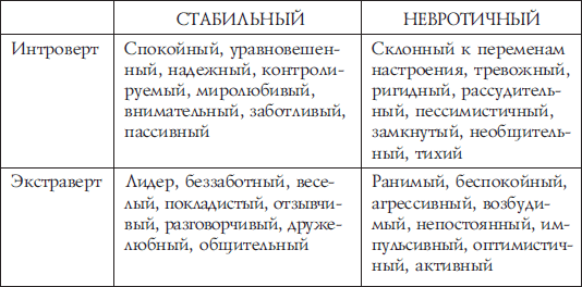 В зависимости от сочетания параметров интроверсия – экстраверсия и нейротизм – стабильность, всех людей можно разделить на четыре группы (табл. 2).