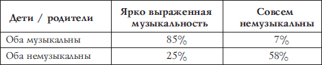 Интересный эксперимент проводился с определением музыкальности у детей и родителей. Сравнивалась музыкальность детей, чьи родители были музыкальны либо немузыкальны. Результаты оказались следующие (табл. 1).
