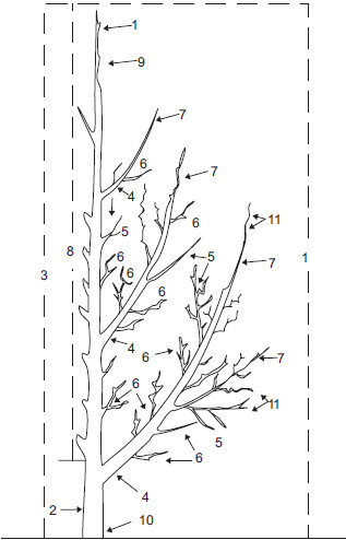 Рис. 2.8. Схема строения надземной части плодового дерева: 1 – ствол; 2 – штамб; 3 – крона; 4 – скелетные ветви; 5 – скелетные разветвления; 6 – обрастающие ветки; 7 – ветки (побеги) продолжения скелетных ветвей и разветвлений; 8 – центральный проводник, лидер; 9 – ветка (побег) продолжения центрального проводника; 10 – корневая шейка; 11 – почки
