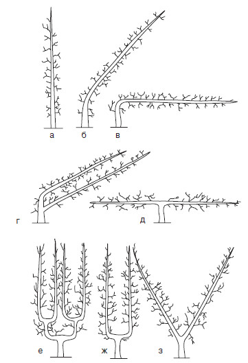 Кордон– это строго вытянутый, как по линейке, ствол или несколько ветвей, покрытых короткими плодовыми веточками. Кордоны могут быть самых различных форм: