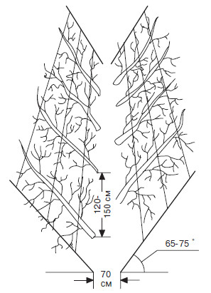 Садовод-любитель из Таганрога Н. Скоробутов предложил конструкцию из двух сближенных рядов деревьев. Вдоль каждого ряда, влево и вправо от центра строчки, он установил наклонную шпалерную опору из трех рядов проволоки под углом 25–35° от вертикали. И назвал все это таганрогской (русской) лодочкой (рис. 2.13).
