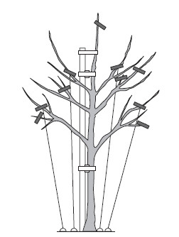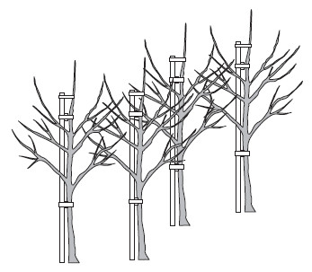 Ветви в горизонтальном положении удерживаются с помощью подвязки. Подвязку производят в год посадки растений к 4–5 колышкам, вбитым в землю, с некоторым наклоном по отношению к штамбу дерева. Можно подвязывать и к проволоке, которую, в свою очередь, прибивают к четырем колышкам, размещенным под деревом.