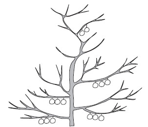 Не радуйтесь обильному цветению и образованию многочисленной завязи. Большинство непременно опадет, при этом сильно истощив дерево. Поэтому в каждом соцветии оставляйте только один центральный цветок. Таким образом, мы удаляем 80 % цветков, оставляя только 20 %. Не волнуйтесь, этого вполне достаточно для высокого урожая. На взрослых деревьях с обычной кроной в формировании урожая участвуют только 3-15 % цветков от их первоначального количества.