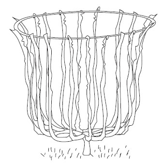 Три саженца-карлика сажаются как пирамидка из ружей – под углом 45°, концами друг к другу. На высоте 0,6–1 м они связываются бечевкой или просто упираются друг в друга рогатками, сформированными заранее. Образуется устойчивая пирамида из трех наклоненных в разные стороны карликовых деревьев. Для прочности в первые годы на высоте 1,5 м можно переплетать ветки между собой и нагибать их.