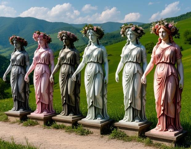 По обеим сторонам тропинки красовались женские статуи в развевавшихся непрозрачных одеждах разных оттенков. Причём, все изваяния были в одинаковых позах, с одинаковыми причёсками. Ещё у статуй были одинаковыми цветочные венки на головах и зажмуренные глаза.
