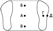4 в) Расположение проекции центра тяжести. Определите положение проекции центра тяжести на плоскость пола. Линия силы тяжести – всегда вертикальна (отвес показывает эту линию наглядно). Поэтому линия силы тяжести, проходящая через центр тяжести, всегда перпендикулярна плоскости пола. Точка, в которой эта линия пересекается с плоскостью пола, называется «проекция центра тяжести». Место расположения проекции центра тяжести в пределах площади опоры тела – это важнейший фактор поддержания равновесия тела (см. далее 14–15).