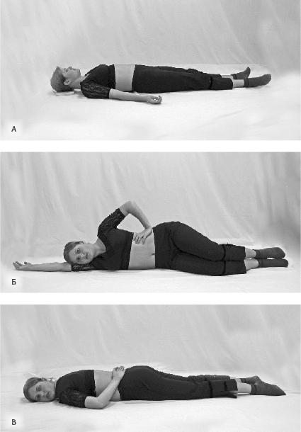 5 б) Действия лежа на спине (навзничь) (см. илл. 15.10 а). Положите обе ладони на ямки тазобедренных суставов. Скажите мышцам живота: слабее… слабее… слабее…