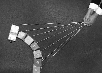 5 Когда отпущен следующий шнур, прикрепленный к кубику «атлант», наклон верхней части башенки вперед еще более увеличивается.