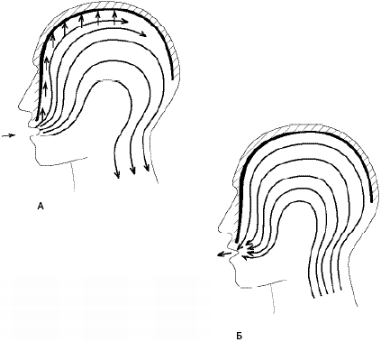 6 При выдохе поток воздуха, образующий верхнюю часть воздушного столба, сначала «омывает» купол. А потом загибается, устремляется вниз, ко рту, и покидает организм.