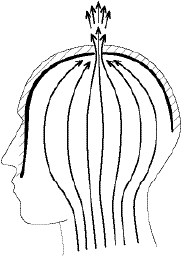 5 в) Воображаемая картина движения воздуха. При вдохе через рот представляйте, что атмосферный воздух направляется от ротового отверстия кверху, к куполу (чем это обусловлено – не имеет значения). Этот поток воздуха «омывает» купол изнутри – и затем, круто загибаясь, устремляется вниз, пополняя воздушный столб, «занимающий» все пространство внутри дышащего тела (см. илл. 17.01).