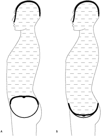 Илл. 17.03. Воображаемое строение аппарата дыхания – «дышащее тело». Изображены купол, диафрагма с ее центром, воздушный столб тела (обозначен штриховкой). Показано положение диафрагмы во время а) «паузы» и б) «вдоха» и «выдоха»