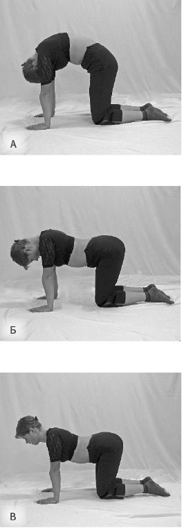 1 а) Изначальное положение. Встаньте на ладони и колени. Выгните спину дугой и уроните голову на расслабленной шее. Это – положение «рассерженная кошка» (см. илл. 19.07 а).