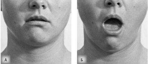 Постоянное внимание на отпущенную нижнюю челюсть, на устремление ее углов вниз.