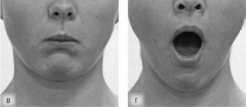 6 в) Голос при лишнем напряжении мышц, управляющих нижней челюстью. Исследуйте другой вариант формирования «мускульного» голоса. Проверьте, насколько отпущена нижняя челюсть, убедитесь, что задние зубы челюстей не соприкасаются. Затем слегка напрягите жевательные мышцы, сохранив достигнутое (чуть опущенное на 1 / 4) положение нижней челюсти.