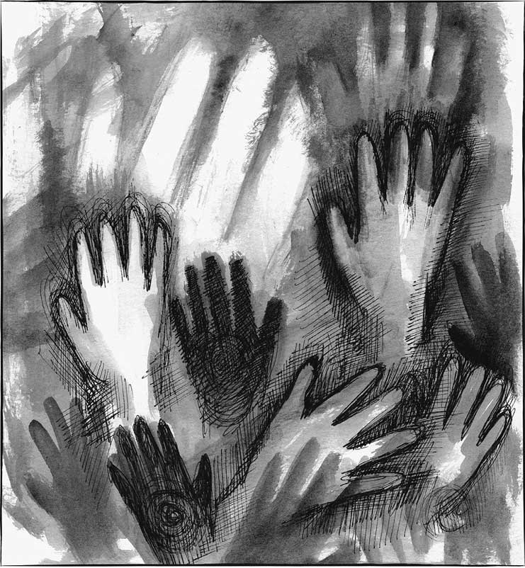 Или более верным может быть другое объяснение, связанное с установлением идентичности. По моему мнению, одним из самых мощных символов в наскальной живописи является оттиск ладони. Такие оттиски делались двумя способами: прижать руку к стене и обвести ее по контуру краской или обильно смазать ладонь краской и «припечатать» ее к стене. Следы ладоней часто просматриваются в слоях рисунков, располагающихся один поверх другого. Причем размеры ладоней очень разные – это наводит на мысль о том, что они были сделаны людьми всех возрастов и полов. Выходит, не только шаманы или художники могли приложить руку к созданию символов, но и любой человек. Отпечатки рук мне видятся одним из самых простых способов оставить свой уникальный след в мире. Они сообщают всем и каждому: «Я существую, я здесь был». Даже сегодня это значение очевидно, особенно когда мы учим детей рисовать пальцами или прижимать ладошки к глине, чтобы они увидели оставленные следы. Когда мы показываем им, как изменить контур руки в другие формы (например, в индюшку!), они познают и изменчивую природу собственных тел.