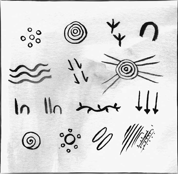 Многие символы в рисунках аборигенов имеют в основе знаки, несущие важную для выживания информацию. Некоторые напоминают следы животных: шеврон с крупной осевой линией, обозначающий отпечатки ног страуса эму, два символа J, повернутые друг к другу «спинами», указывали на отпечатки лап кенгуру, а волнистая линия с бахромой отображала следы варана (самой крупной ящерицы в мире). Другие символы представляют животных целиком: группы маленьких точек – муравьи, большие овалы – яйца, толстые волнистые линии – змеи, замкнутые кольца – черви. Кроме того, есть символы для обозначения особенностей ландшафта, имеющих значение для выживания. Концентрическими кругами и спиралями маркировали места скопления воды. Если такие объекты соединены параллельными волнистыми линиями, значит между ними есть проточная вода. Места сбора также обозначались концентрическими кругами, но их окружали диагональные линии, направленные в центр круга. Также существует набор символов для охотничьего снаряжения, в основе которых лежат упрощенные схематические очертания копий, щитов и бумерангов. Ряд символов имеет максимально примитивную форму: например, перевернутая буква U обозначает человека, в соединении с различными вариациями вертикальных линий она представляет мужчин или женщин, а также их возраст.