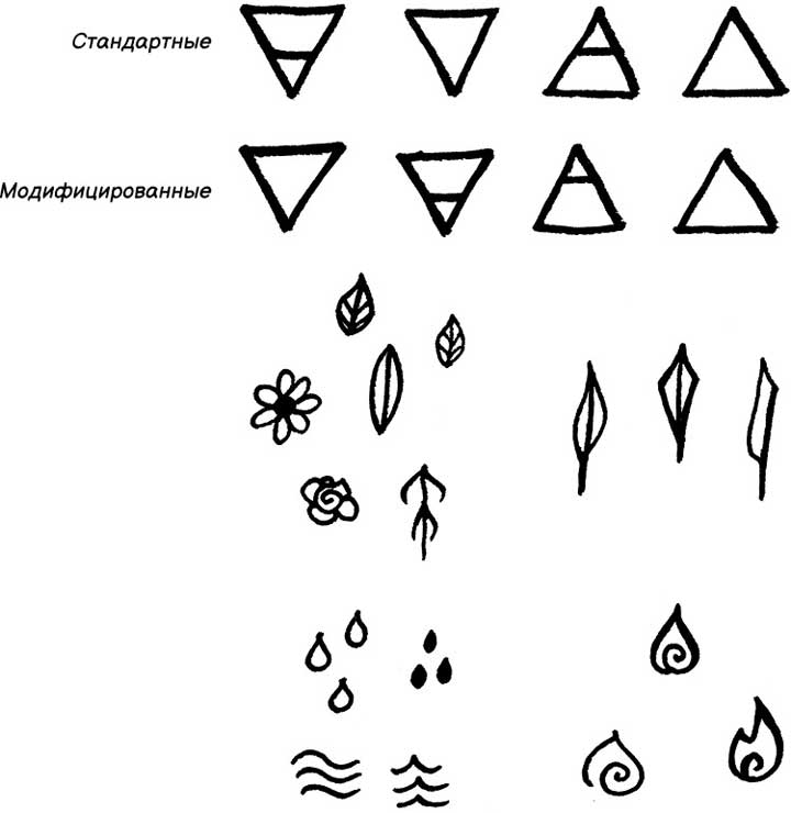 К алхимическим символам нужно просто привыкнуть – в этой системе все стихии представлены в виде треугольников, стоящих либо на основании, либо на одном из углов, а также либо имеющих внутри горизонтальную линию, либо нет. Я включила в книгу традиционный набор символов (земля, вода, воздух, огонь), а также видоизмененную версию, с которой часто сталкиваюсь в последние годы. Эта версия практически идентична традиционной, за исключением того, что земля и вода идут в другом порядке. Я предпочитаю именно эту систему, потому что она несет для меня больше смысла. Почему? Мне кажется, что воздух и вода, имея внутри горизонтальные линии, демонстрируют способность постепенно заполнять пространства. Огонь поглощает все на своем пути, а земля – это твердая субстанция, поэтому отсутствие линий правдивее отражает их природу.