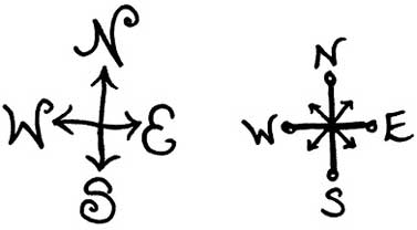 Возможно, в своих сигилах вам будет необходимо указать направление или сторону света. Один из вариантов – использовать символ розы ветров в качестве ориентира на пути к цели. Или можно сосредоточиться на конкретном направлении, если речь идет о физическом движении. Другим способом задать курс являются не буквы (N (С), S (Ю), E (В), W (З)), а размещение прочих знаков в сигиле таким образом, чтобы они явно отражали соответствие определенной стороне света. Вам необходимо что-то, чтобы выразить идею движения на восток или обозначить остановку на западе? Так добавьте подходящий символ (например, стрелку или «X») в соответствующем месте своего сигила. Ниже я привожу удобный список обозначений, которые успешно используются в современной традиции.