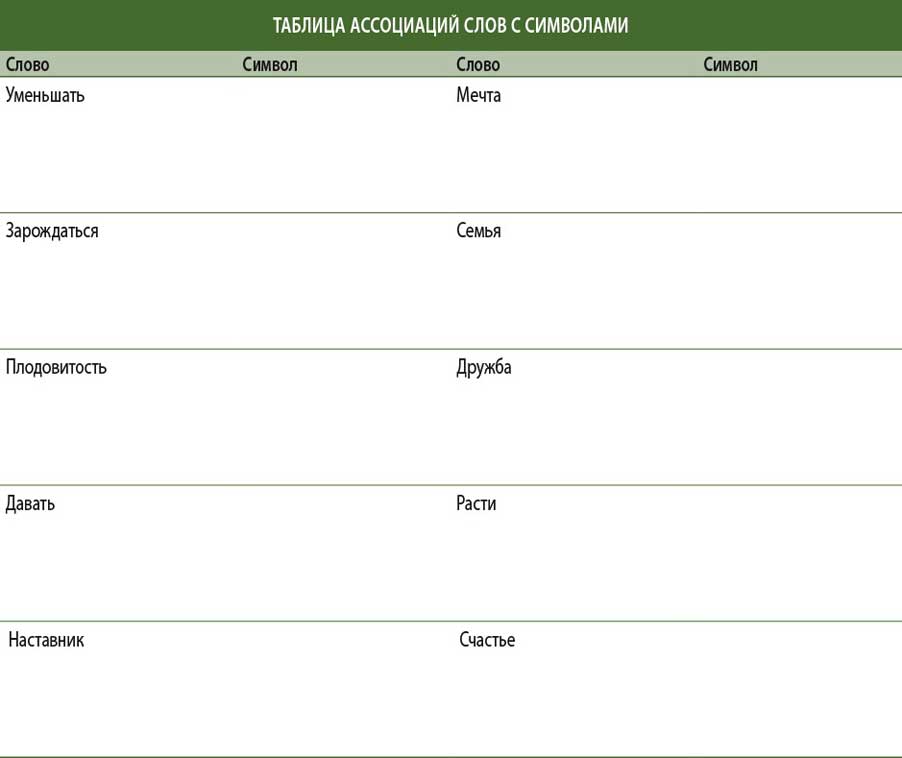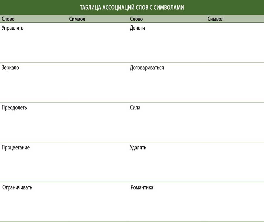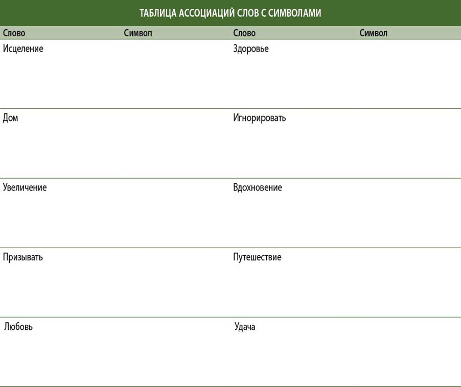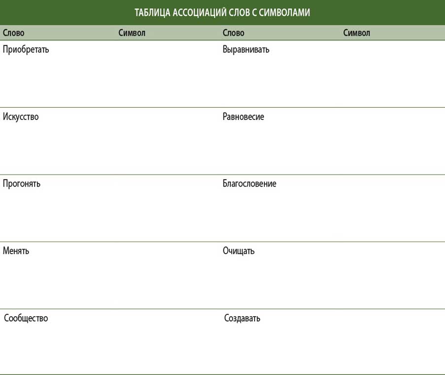Не стесняйтесь добавлять в список другие слова или искать синонимы, если они больше откликаются внутри вас. Можете составить список соответствий слов и символов, которым будете пользоваться в дальнейшем в ходе практик. Просто убедитесь, что он вам подходит и совпадает с личными ассоциациями. Со временем для вас станет естественным в уме проводить ассоциации между словами и символами.