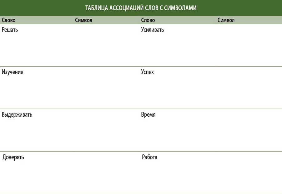 Чтобы подготовить вас к восприятию следующей главы, я составила список слов, которые обычно фигурируют при работе с сигилами. Уделите время и поразмышляйте, как бы вы передали каждое из них с помощью символа. Помните, это упражнение не преследует цель создать справочник соответствия слов символам, с которым вы будете сверяться всю жизнь. Слова могут менять значение в зависимости от времени и ситуации, но необходимо научить свой мозг связывать слова и образы. Поэтому запишите возникшие у вас по этому поводу идеи: в следующей главе вы поймете, почему так важно их записать. Это упражнение определенно поможет в целом ряде магических практик, не только в магии сигилов!