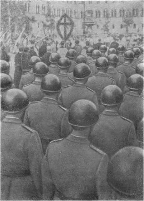 Религиозная процессия частей бундесвера в Мюнхене в мае 1959 г. Такие шествия, осененные крестом, можно часто видеть на улицах городов Западной Германии. Их организует военное духовенство с целью разжигания религиозного фанатизма среди солдат бундесвера и населения ФРГ