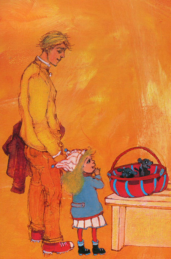 Мы с папой долго ходили по рынку, хрустели кислой капустой и искали орхидеи. И вдруг я почувствовала, как моё сердце забилось сильнее: тук-тук! Моё сердце всегда делает «тук-тук», когда поблизости оказывается симпатичная собачка. «Ту-тук-тук» – стучало оно теперь, потому что у рыночных ворот стоял мужчина с тремя чудесными собаками. Большой чёрный пудель сидел у ног мужчины, а рядом с пуделем стояла корзинка с двумя ужасно милыми, просто жуть какими прелестными щеночками. Я взяла папу за руку и подвела к щеночкам.