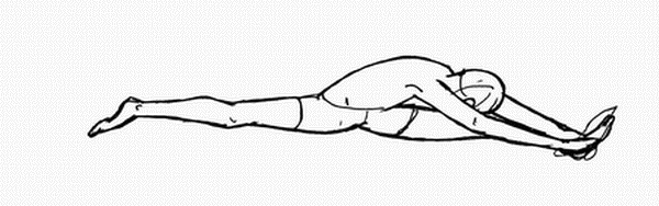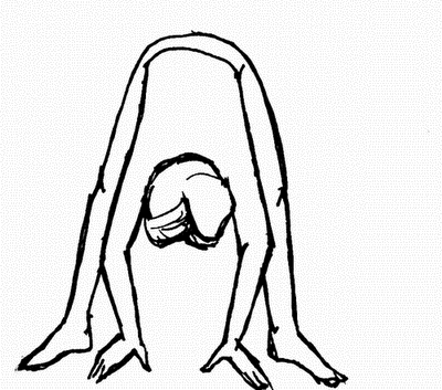 3. Теперь на выдохе наклоняйся вперед, стараясь согнуться пополам так, чтобы грудь коснулась бедер, а голова – колен. Ладони рук в идеале должны лечь на пол рядом со ступнями ног. Для начала это не просто, особенно если раньше ты не особенно увлекался растяжкой или имеешь не слишком гибкую спину. Однако Сурья Намаскар очень здорово растягивает мышцы, и уже через недельку ты просто поразишься своей гибкости. Закончить выдох желательно в конечной фазе наклона – и опять застынем на некоторое время в этой позиции пока не захочется вдохнуть. Рекорды ставить не надо: иначе комплекс пойдет не на пользу, а на вред.