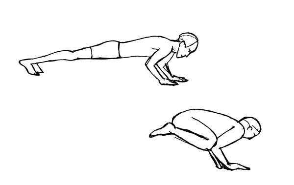 Итак, до боли в ладонях прими знакомый упор лежа. Теперь припади к земле и – прыгай. Вперед. Всем корпусом. И старайся приземлиться на ладони и ступни, а не на грудь и лицо, что частенько случается с новичками. Прыжок резкий и одновременный, толчок энергичный, иначе ты просто не оторвешься от земли. Прыгнул? Теперь прыгай назад. Со временем можно попробовать прыжки в сторону, прыжки с поворотом. Более сложный вариант – прыжок с выносом, когда твои ноги при приземлении окажутся впереди рук, а тело повернется к потолку передом. Но для этого нужно очень высоко прыгнуть. Есть еще вариант – приземлиться таким образом, чтобы образовалась волна – сначала земли касаются руки, затем плавно опускаются ноги, но как только ступни ног приземляются на пол, руки отталкиваются от него в новом прыжке. Почти хип-хоп. Только китайский. Пробуй. Возможно, получится, если долго мучиться.