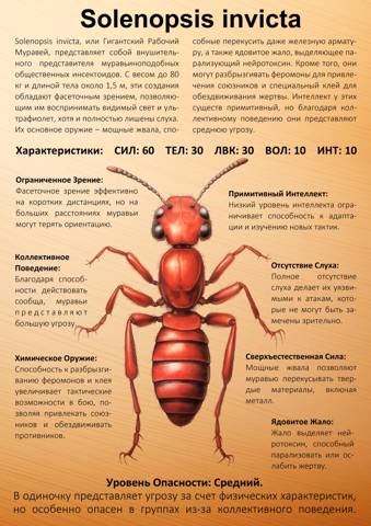 [ Solenopsis invicta, рабочая особь, – подвид муравьиноподобных общественных инсектоидов. Вес – от 80 до 120 кг., длина тела – около 2,5 м… Зрение – фасеточное, воспринимает видимый свет и ультрафиолет. Слух – отсутствует. Оружие – мощные жвала, способные перекусить железную арматуру. Имеет ядовитое жало, которое выделяет парализующий нейротоксин. Может разбрызгивать феромоны, привлекающие других муравьев, и специальный клей, обездвиживающий жертву. Интеллект – примитивный, неразумен. Как правило, действуют коллективно. Уровень опасности – средний. ]