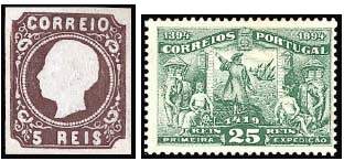 ПОРТУГАЛИЯ[Portugal], Португальская Республика – гос-во на юго-зап. Европы, в зап. части Пиренейского п-ова, на о-вах Азорских и Мадейре (в Атлантическом океане). Первые марки П. вып. в 1853, назв. гос-ва на них не было, с 1866 на марках – назв. страны. В 1876 вып. газетная марка. С1894 в обращении первые памятные марки. Авиапочт. марки изд. с 1923, первый блок – в 1940; служебные марки – 1938 – 75, посылочные – 1920—36, освобождения от почт. сбора– 1889—1938, почт.-налого-вые – 1911– 25, телеграфные – 1922. Для автономных провинций Азорские о-ва и Мадейра с 1980 вып. специальные марки и блоки.