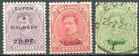 ЭЙПЕН И МАЛЬМЕДИ[Eupen et Malmedy]. После поражения Германии в 1-й мировой войне районы Э. и М. вошли в состав Бельгии. С янв. 1920 на их тер. стала работать белы, почта. 15.01.1920 в обращение поступили марки Бельгии снадпечаткой (франц.) назв. «Эйпен-Мальмеди» и номинала в герм, валюте. В мар. 1920 на тер. была введена бельг. валюта и стали вып. марки Бельгии с надпечатками «Эйпен» и «Мальмеди» для каждого района отдельно; могли использ. и в др. районах Бельгии. Изъяты 30.04.1931.