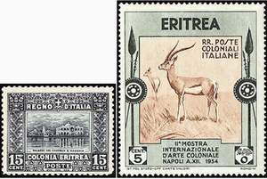 ЭРИТРЕЯ[Eritrea] – с 1890 итал. колония на сев.-вост. Африки (ныне провинция Эфиопии). В 1938 включена в состав Итал. Вост. Африки. До 1890 на тер. Э. в Асэбе и Массауа существовали почт. отделения Италии, кот. использ. марки Италии,а также марки итал. почты за границей. Первые марки колонии – надпечатка (итал.) «Колония Эритрея» на марках Италии – вып. в 1893, первые марки с оригинальными рис. – 1910. Изд. почт., авиапочт., экспрессные, почт.-благотворительные, памятные, служебные, посылочные, доплатные, почт.-налоговые и расчетные марки.