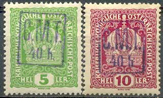 ЮЖНАЯ ГАЛИЦИЯ И БУКОВИНА.В нояб. 1918 Румыния оккупировала тер. Буковины и Южн. Галиции (г. Коломыя). В июне 1919 в обращение поступили марки Австриис надпечаткой (румын.) аббревиатуры назв. Военного управления в прямоугольной рамке и нового номинала. В авг. 1919 Южн. Галиция была передана Польше, а Буковина включена в состав Румынии, и в обращение поступили марки Польшии Румынии(соотв.)