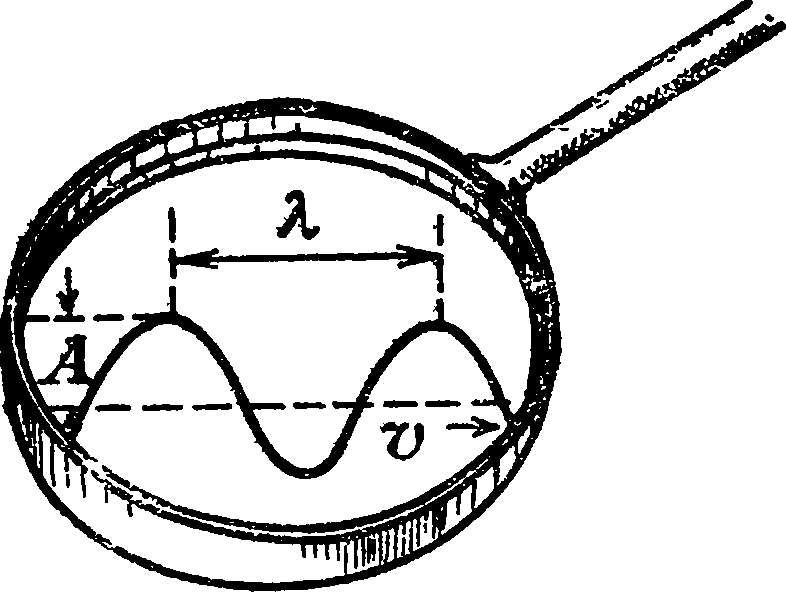 «Волна» – одно из самых необходимых слов физики. Каждый представляет себе ее по-разному: один сразу же видит волны от брошенного в пруд камня, другой – синусоиду. Поскольку синусоиду рисовать проще – воспользуемся ею. У этой схематической волны четыре свойства: амплитуда А, длина волны X, частота v и скорость распространения v. Амплитуда волны – это наибольшая ее высота. Что такое длина волны – понятно из рисунка. Скорость ее распространения, по-видимому, особых пояснений не требует.