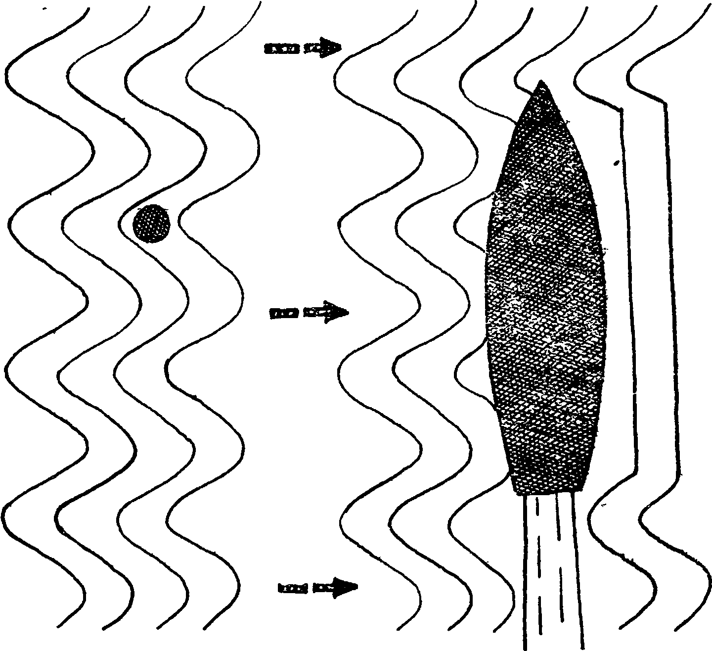 Известен даже способ ее построения: сначала нужно провести линии через все гребни волн – как говорят в физике, отметить фронт волны, а затем от источника света провести линию, которая перпендикулярна к фронту волны. Это и будет траектория светового луча. Если вблизи препятствия фронт волны искажается, то одновременно с этим искривляется и траектория луча – луч света огибает препятствие, происходит дифракция.