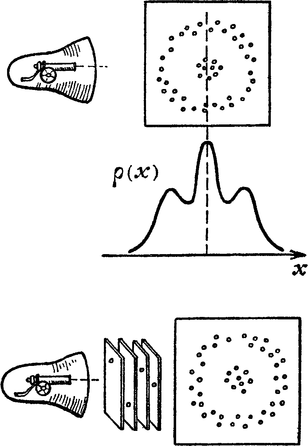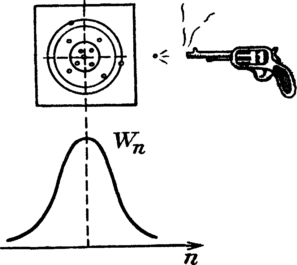 всем в момент вылета иметь одни и те же начальные координаты Xq и скорости V0 (или импульсы Ро). А это возможно лишь в том случае, если вы целитесь безошибочно и, кроме того, заряд пороха во всех патронах в точности одинаков. Ни то, ни другое обычно не достижимо. Поэтому распределение отверстий от пуль на мишени всегда подчиняется законам случая, и можно говорить лишь о вероятности попадания в «десятку» или «девятку» мишени, но никогда нельзя быть уверенным в этом заранее.