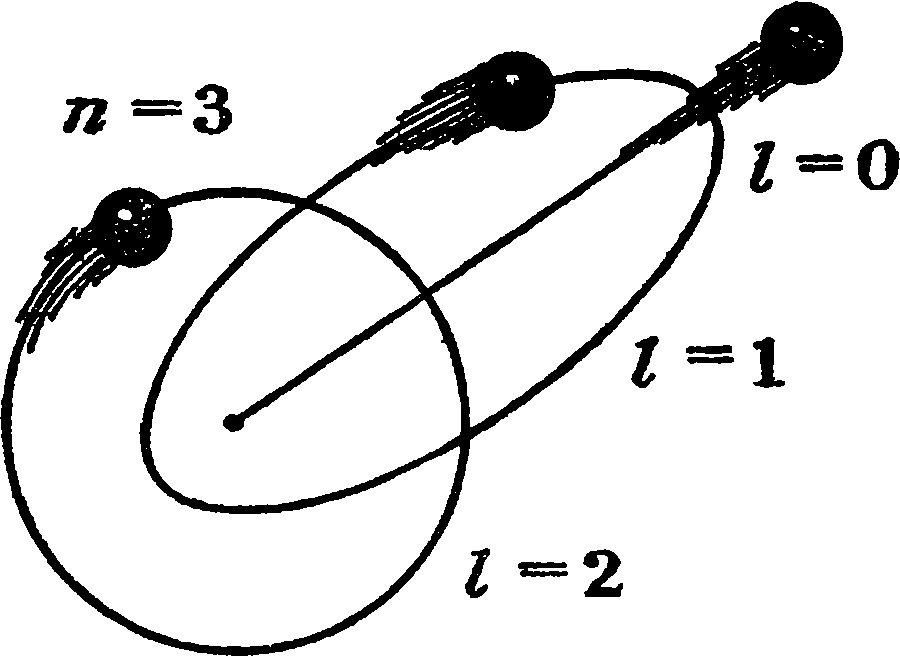 Эллипсы с одинаковой большой полуосью принадлежат одному и тому же значению главного квантового числа п, так как энергии электрона на таких орбитах равны между собой (Зоммерфельд знал доказательство, а нам придется просто поверить в это). Эллипсы различаются по степени сплющенности, которая зависит от орбитального момента /. Вполне в духе идей Бора Зоммерфельд предположил, что при заданном п эллипсы могут быть сплющены не произвольным образом, а только так, чтобы орбитальное квантовое число I, которое их различает, принимало целые значения Z = 0, 1, 2, ..., п — 1, то есть число допустимых эллипсов равно числу п, нумерующему стационарные состояния.