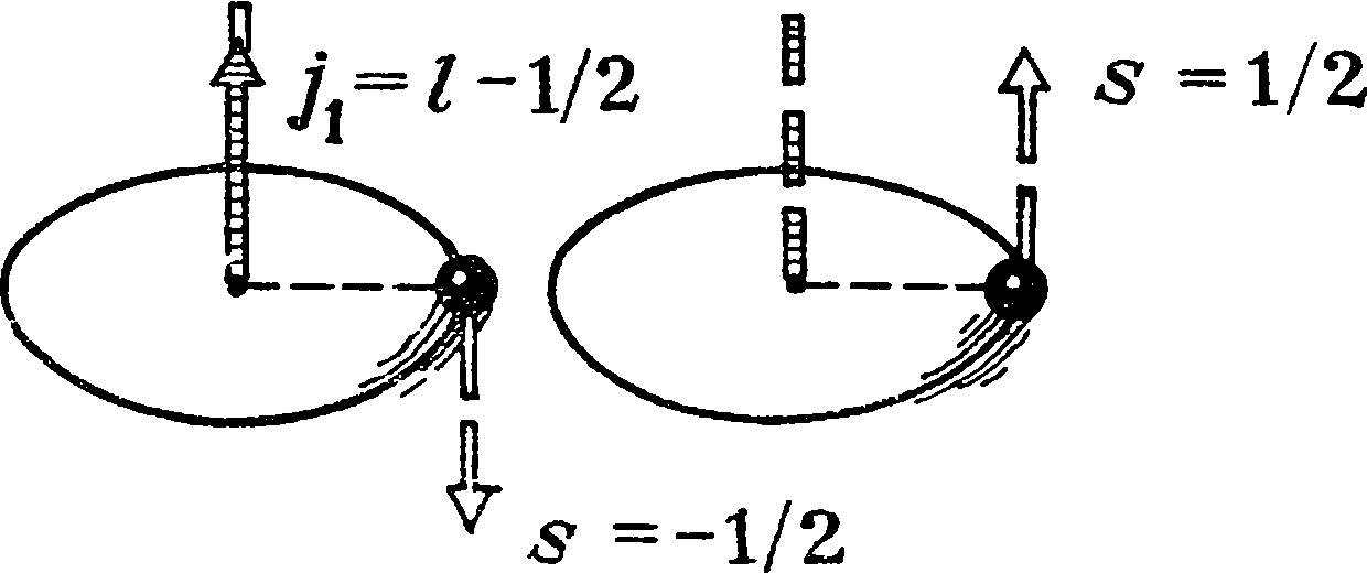 ния, или спин s (от англ, spin – веретено), равный по величине s=l/2. Складываясь с орбитальным моментом /, этот внутренний момент 5 может его увеличить или уменьшить. В результате возникает полный момент j, равный либо /1 = = /—1/2, либо j2 = /+l/2 – в зависимости от взаимной ориентации векторов I и 5. Если / = 0, то полный момент и спин совпадают (/=5 = 1/2).